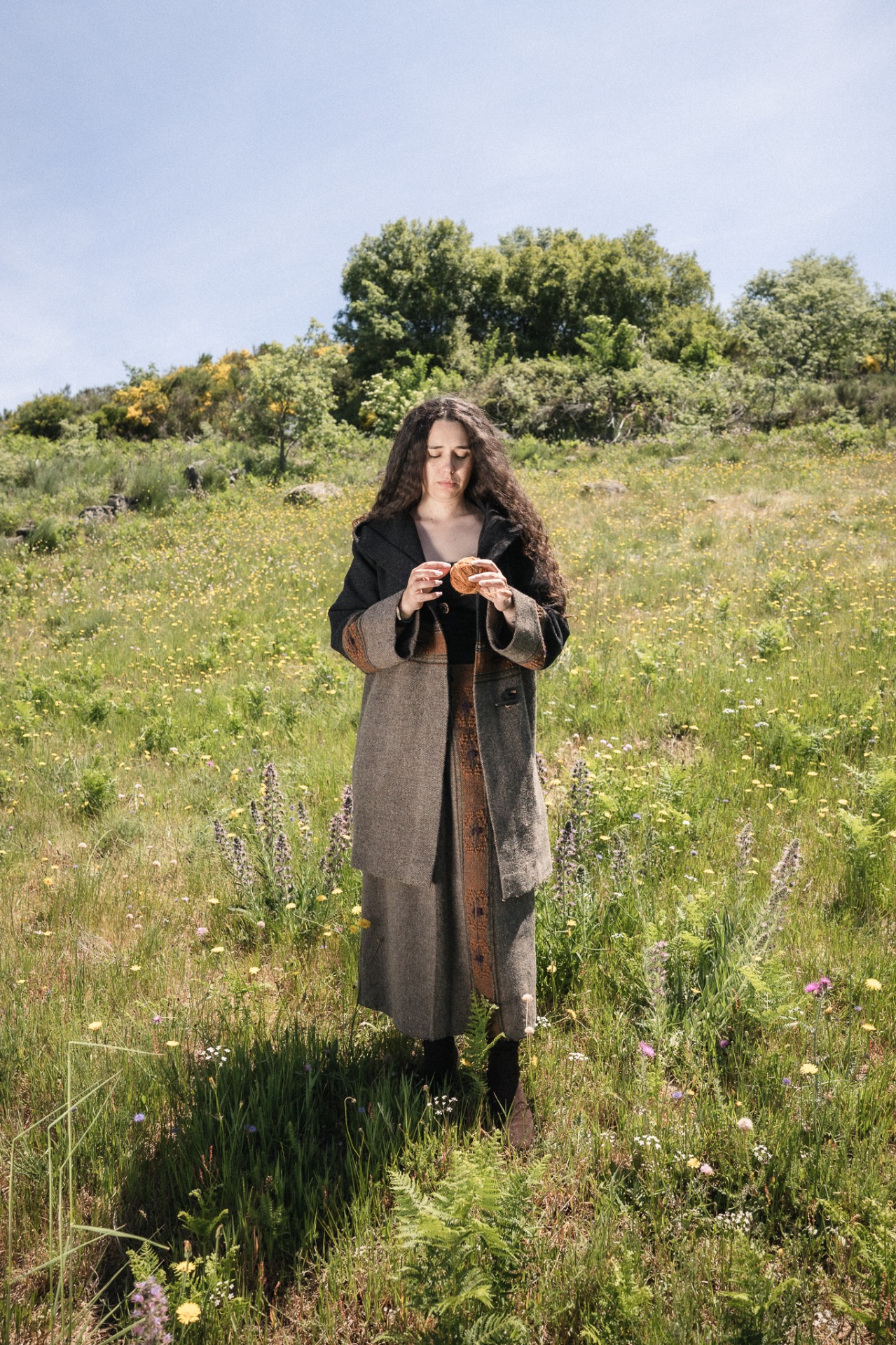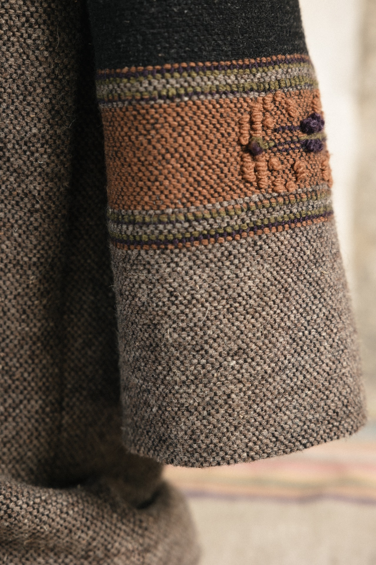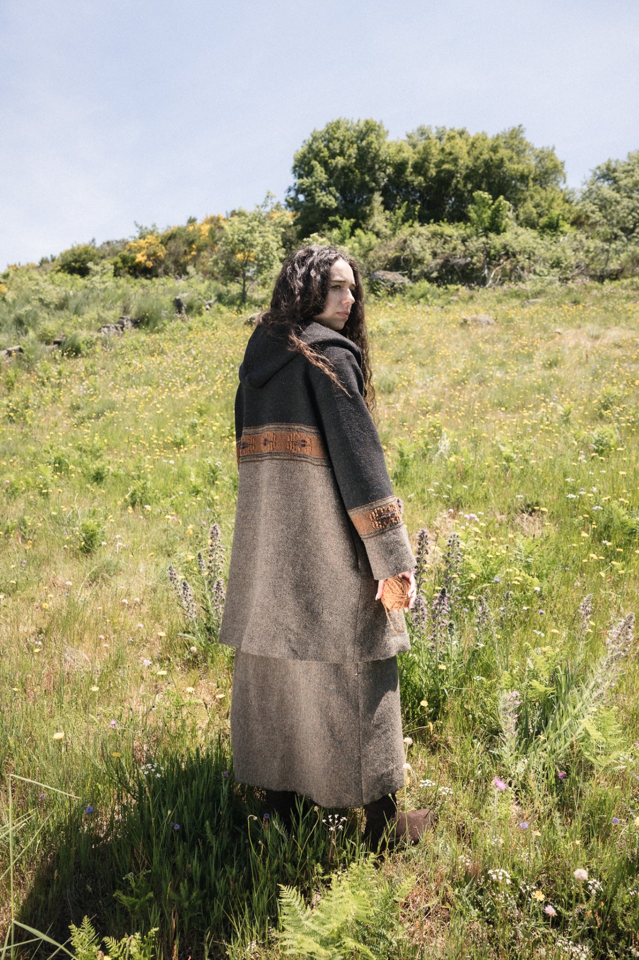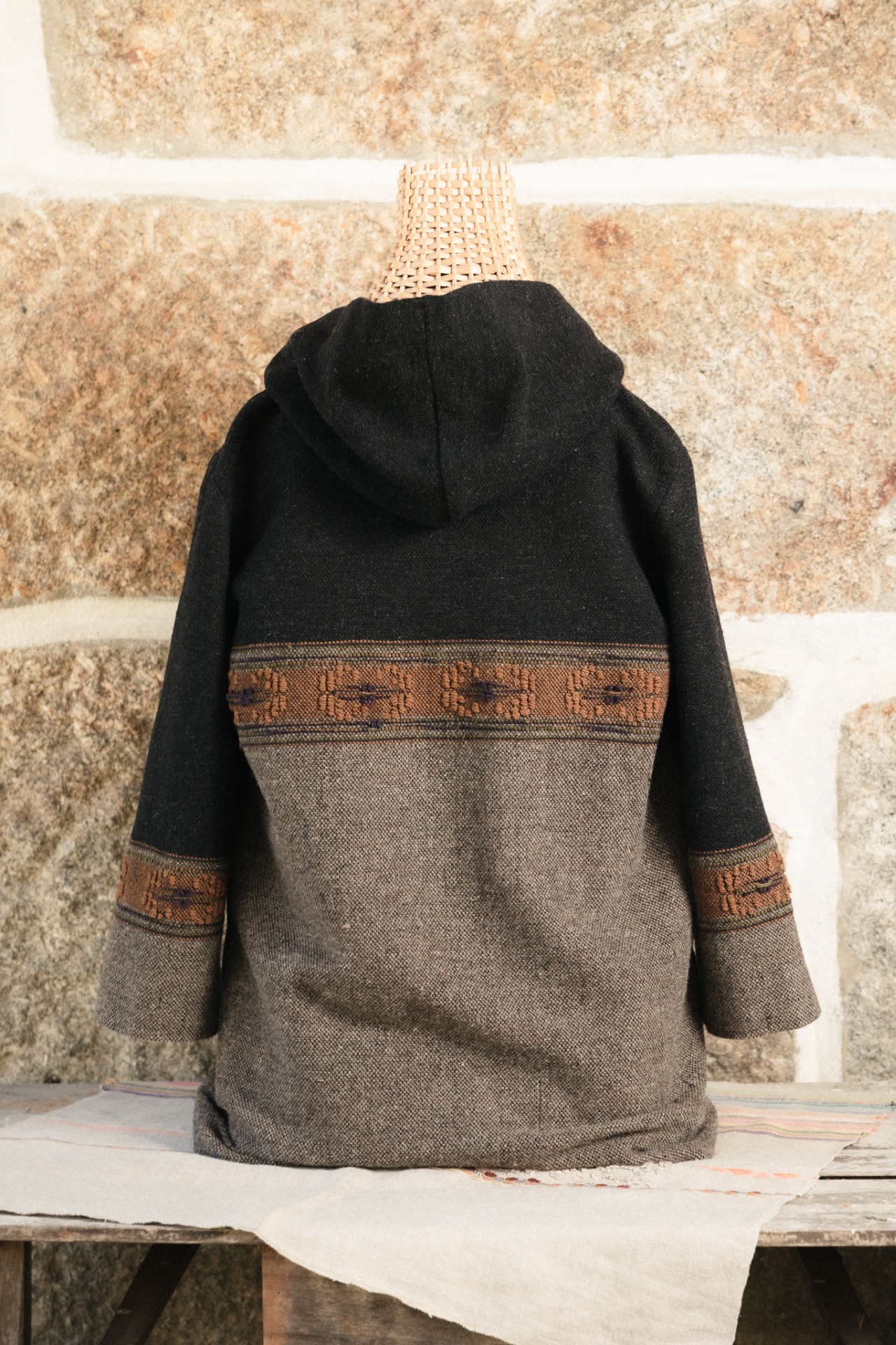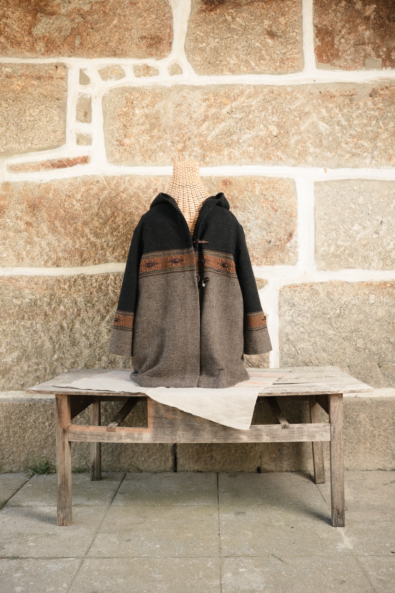 Casaco com carapuço em tecelagem manual bicolor. Parte de cima em lã cinzenta e parte de baixo em lã mesclada, com barra de puxados de técnica tradicional no peito e punhos. Bolsos metidos na costura lateral. Forrado.
