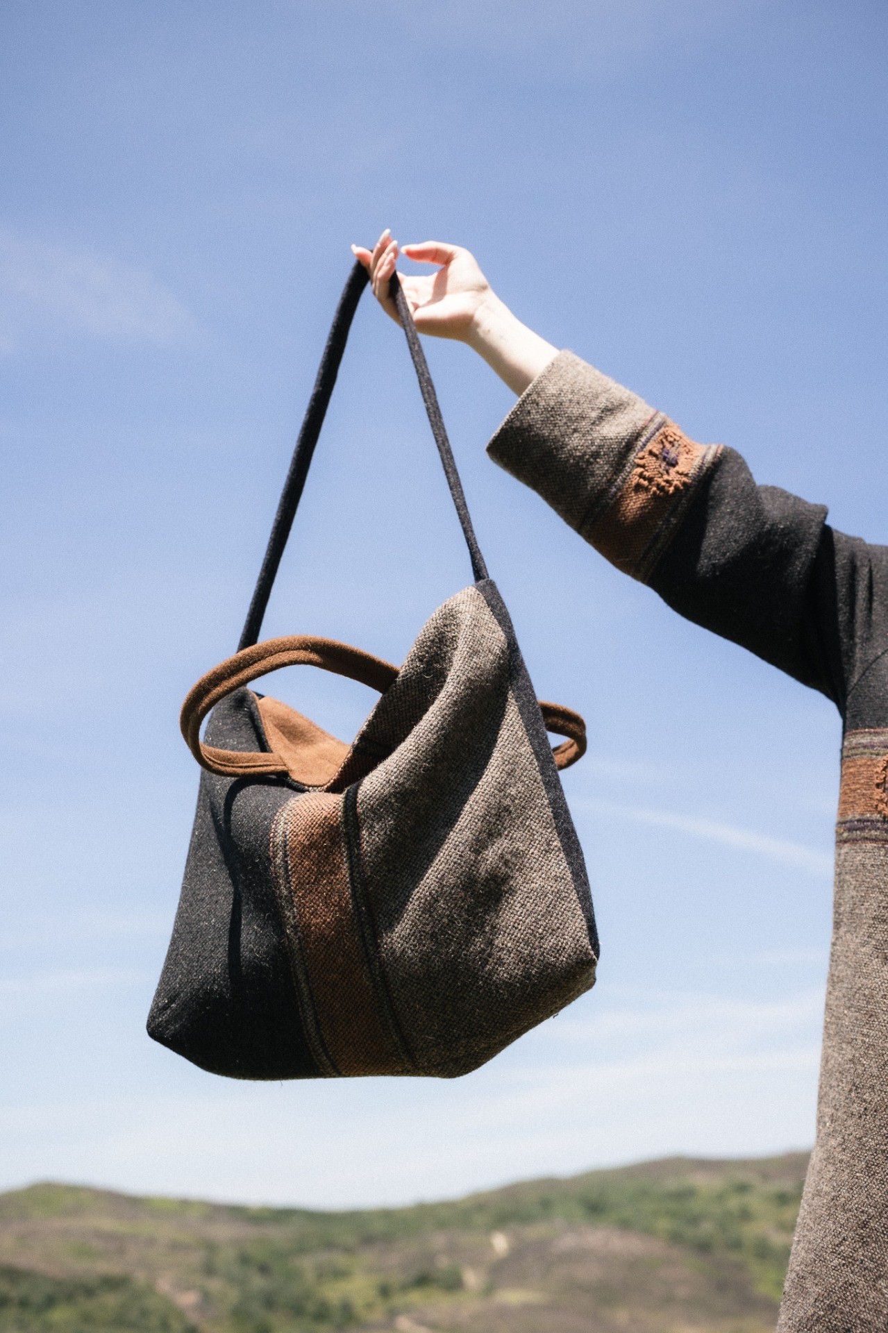 Carteira em tecelagem manual de lã de ovelha cinzento e mesclada. Detalhes em burel.