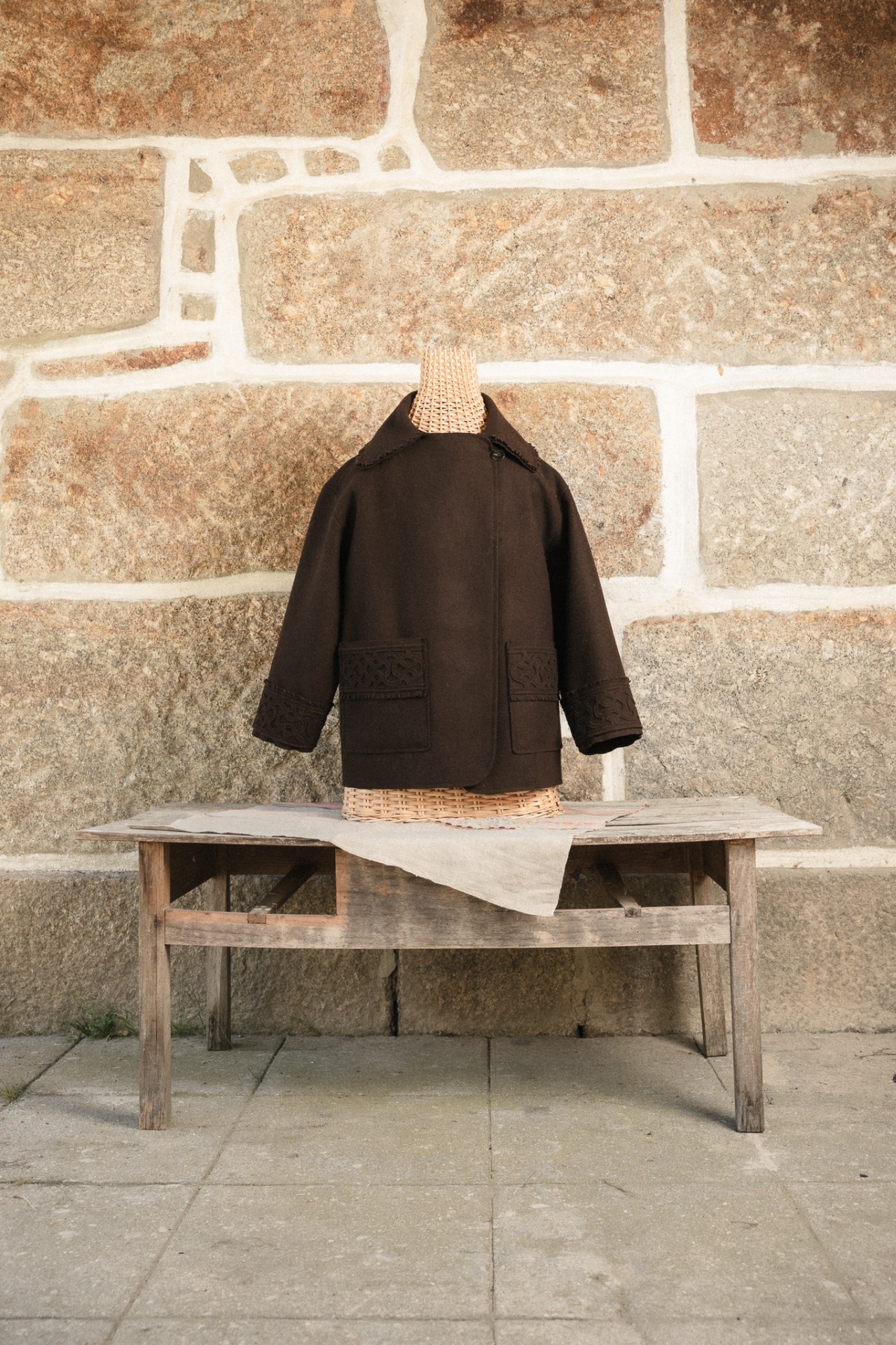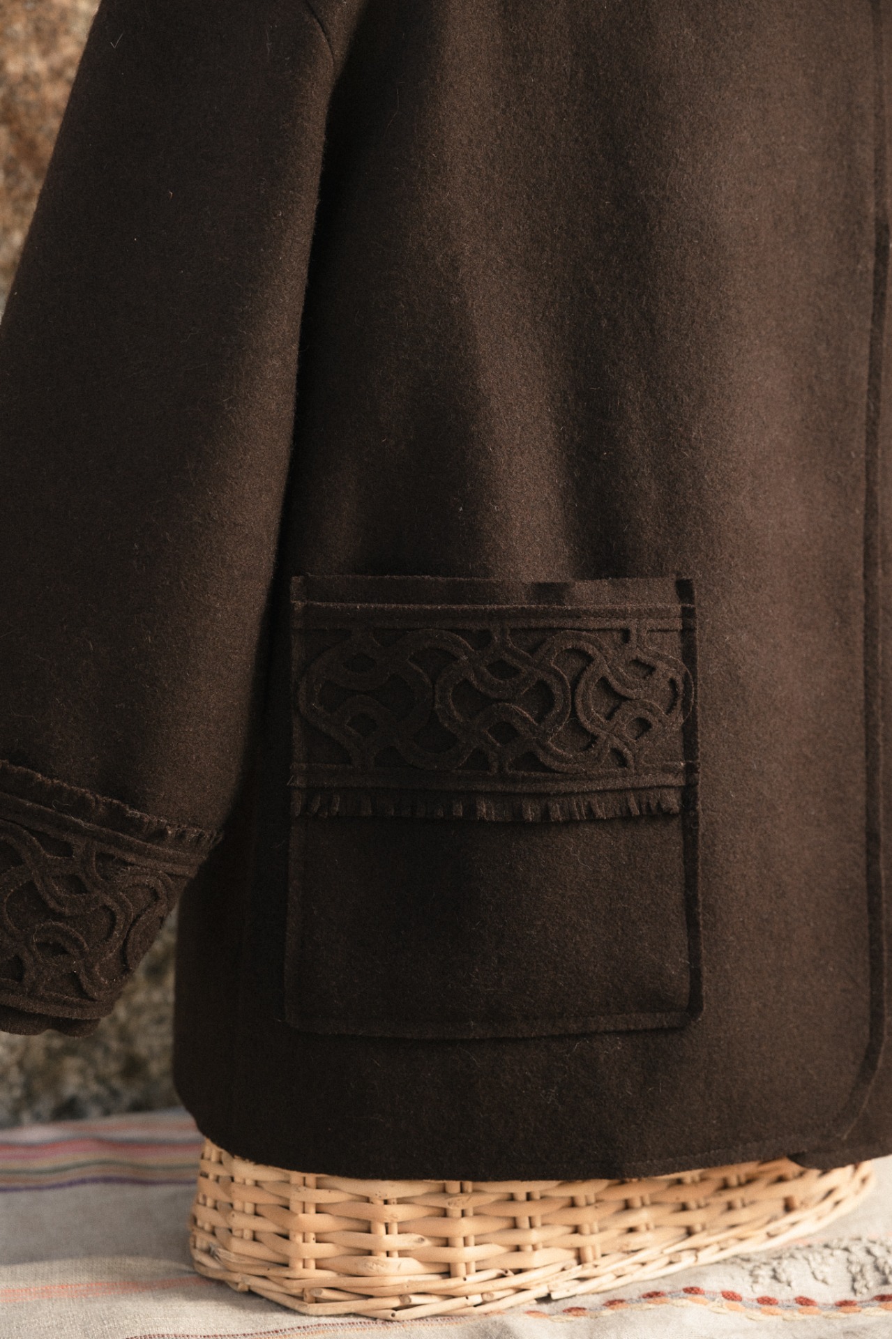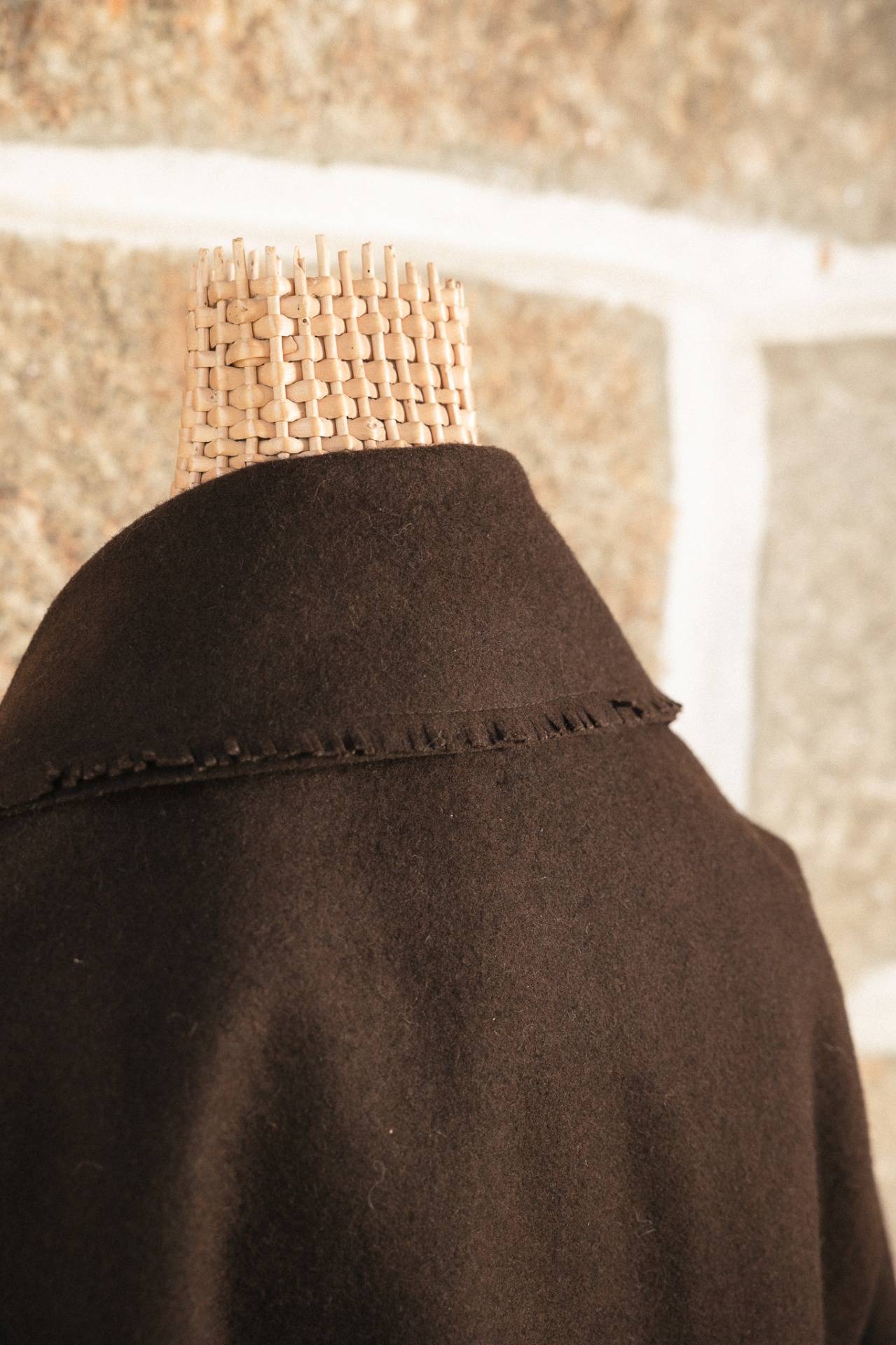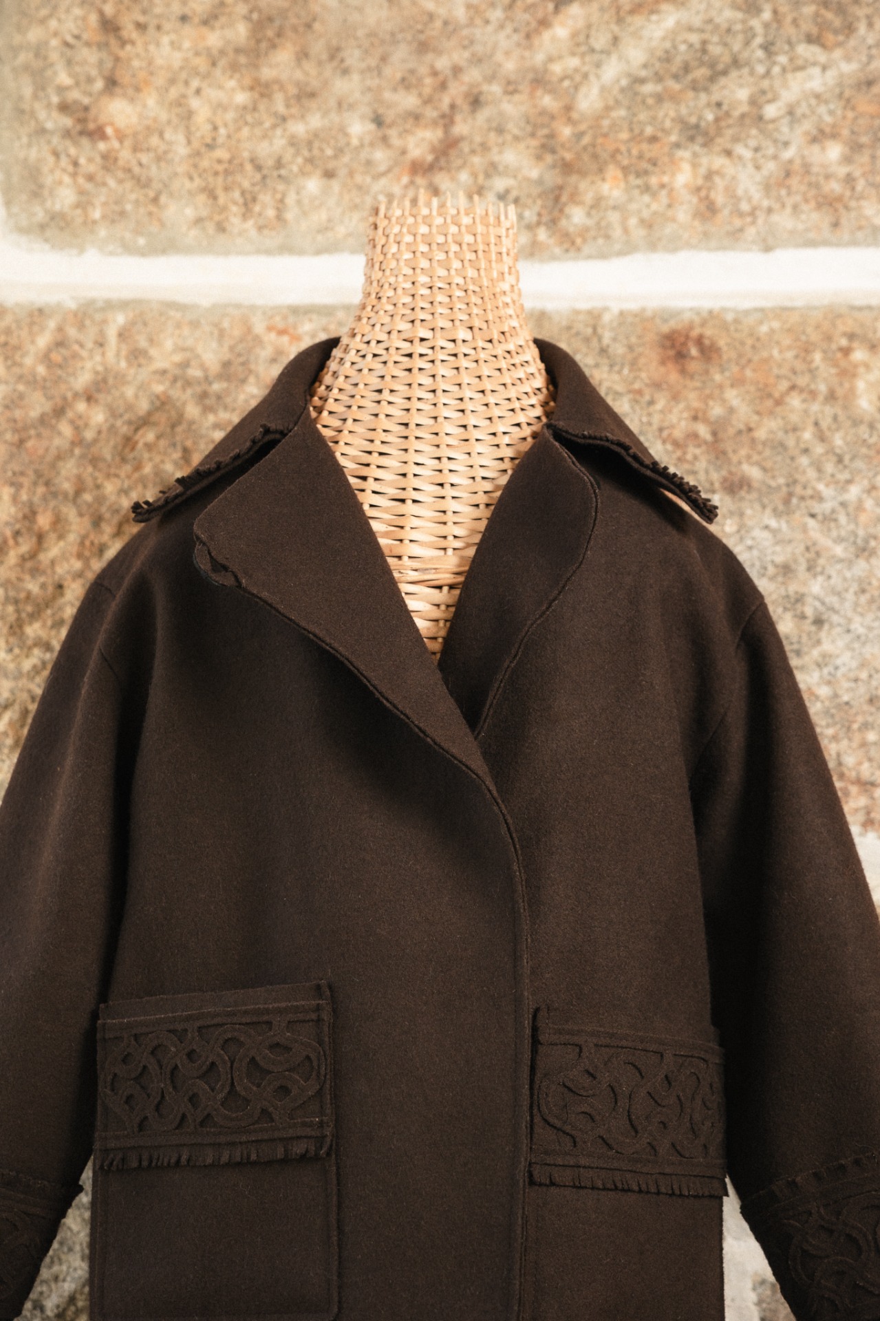 Casaco de trespasse em burel castanho. Bolsos bordados manualmente com técnica dos recortes. Gola com franja recortada.