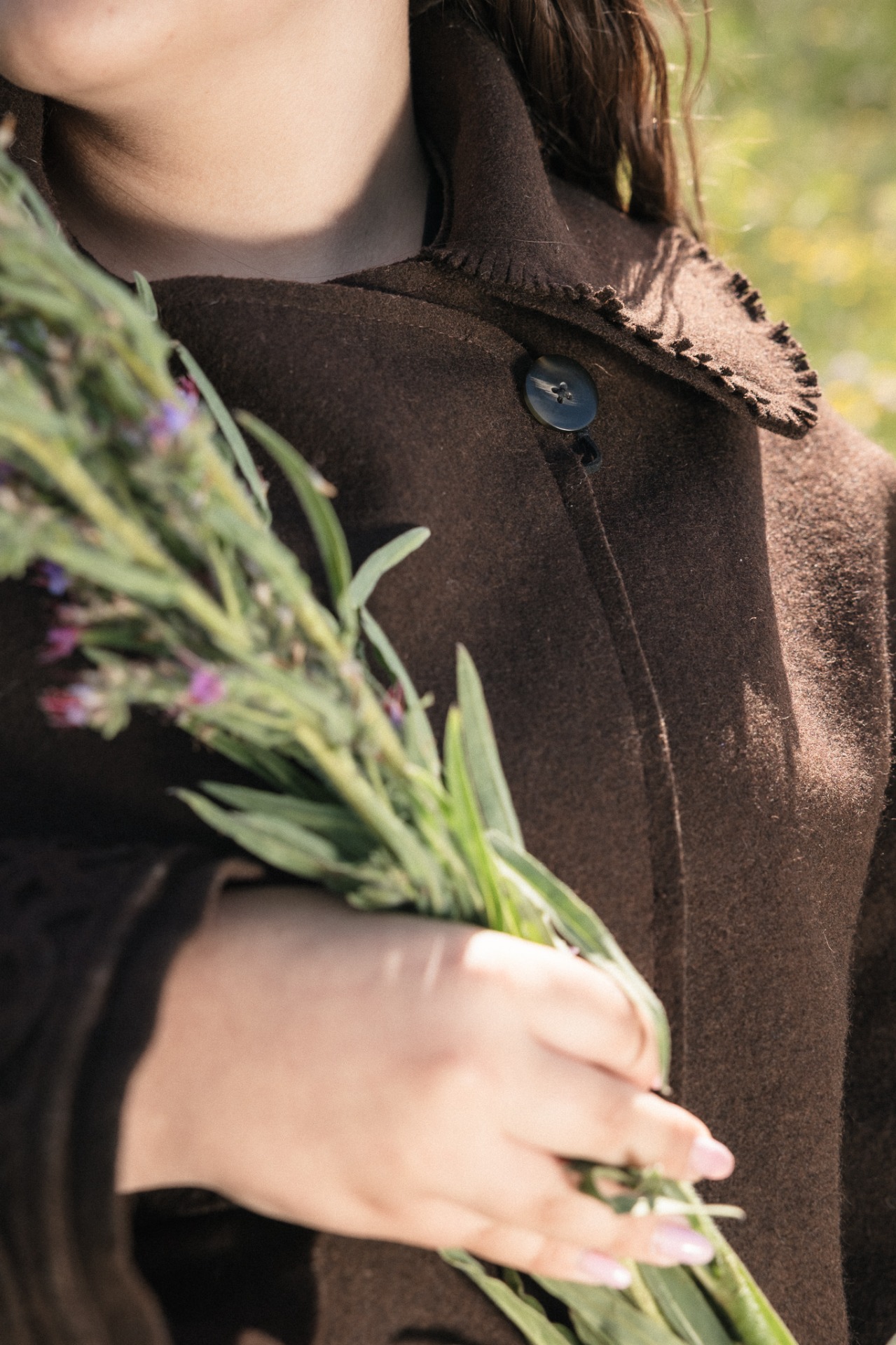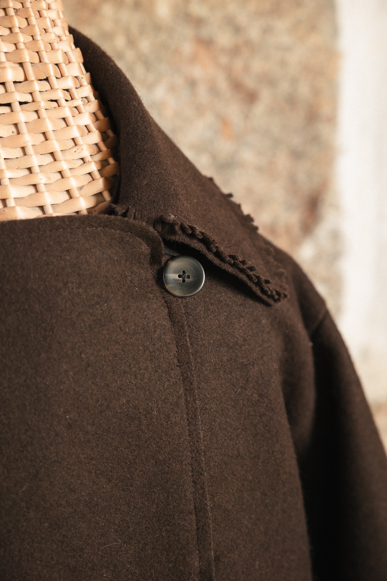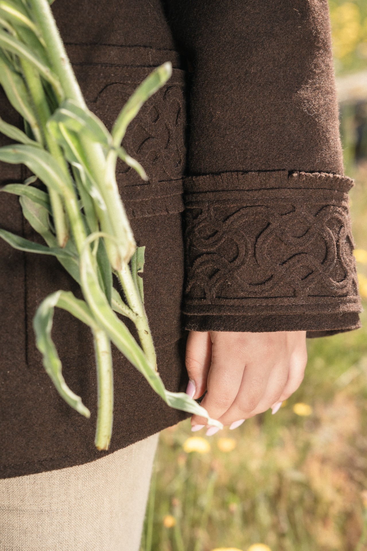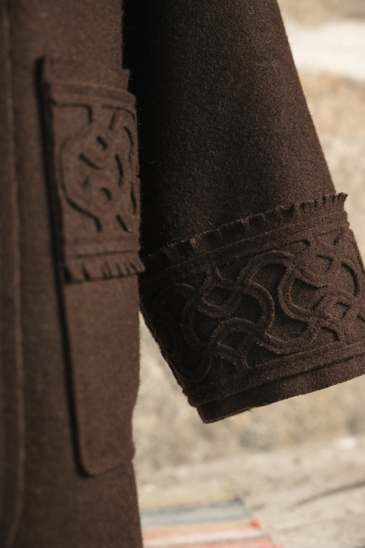 Casaco de trespasse em burel castanho. Bolsos bordados manualmente com técnica dos recortes. Gola com franja recortada.