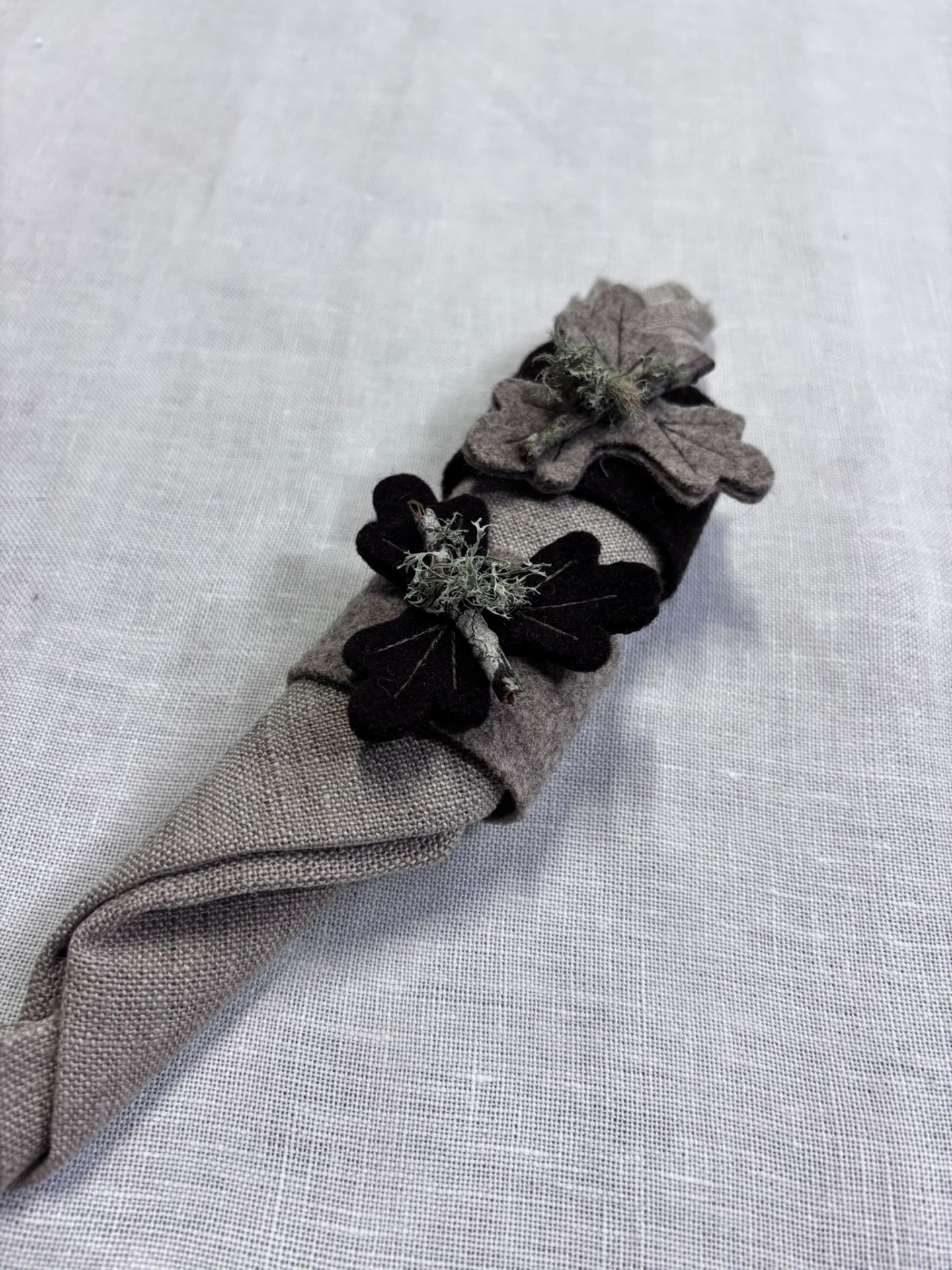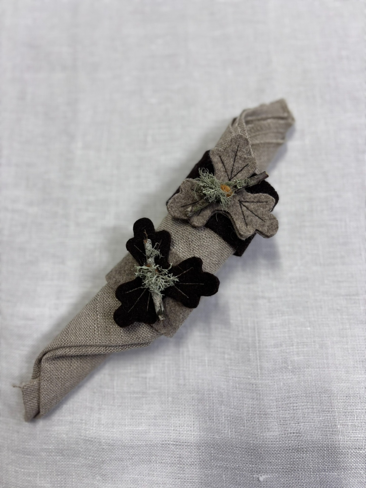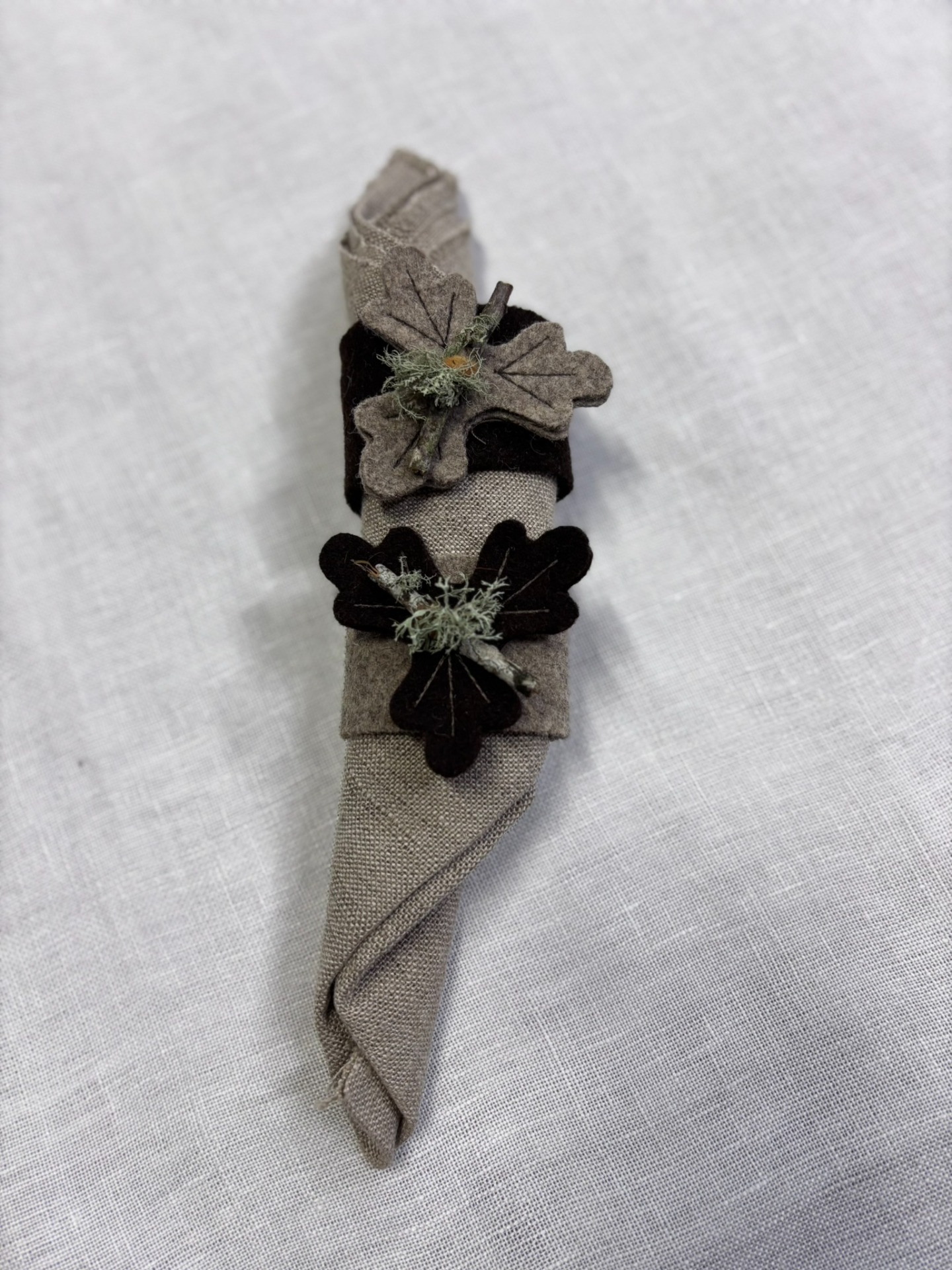 Porta guardanapos feitos em burel de cor natural antracite e castanho, com detalhe de raminho de carvalho.