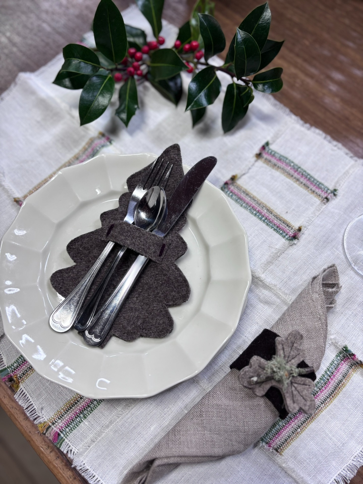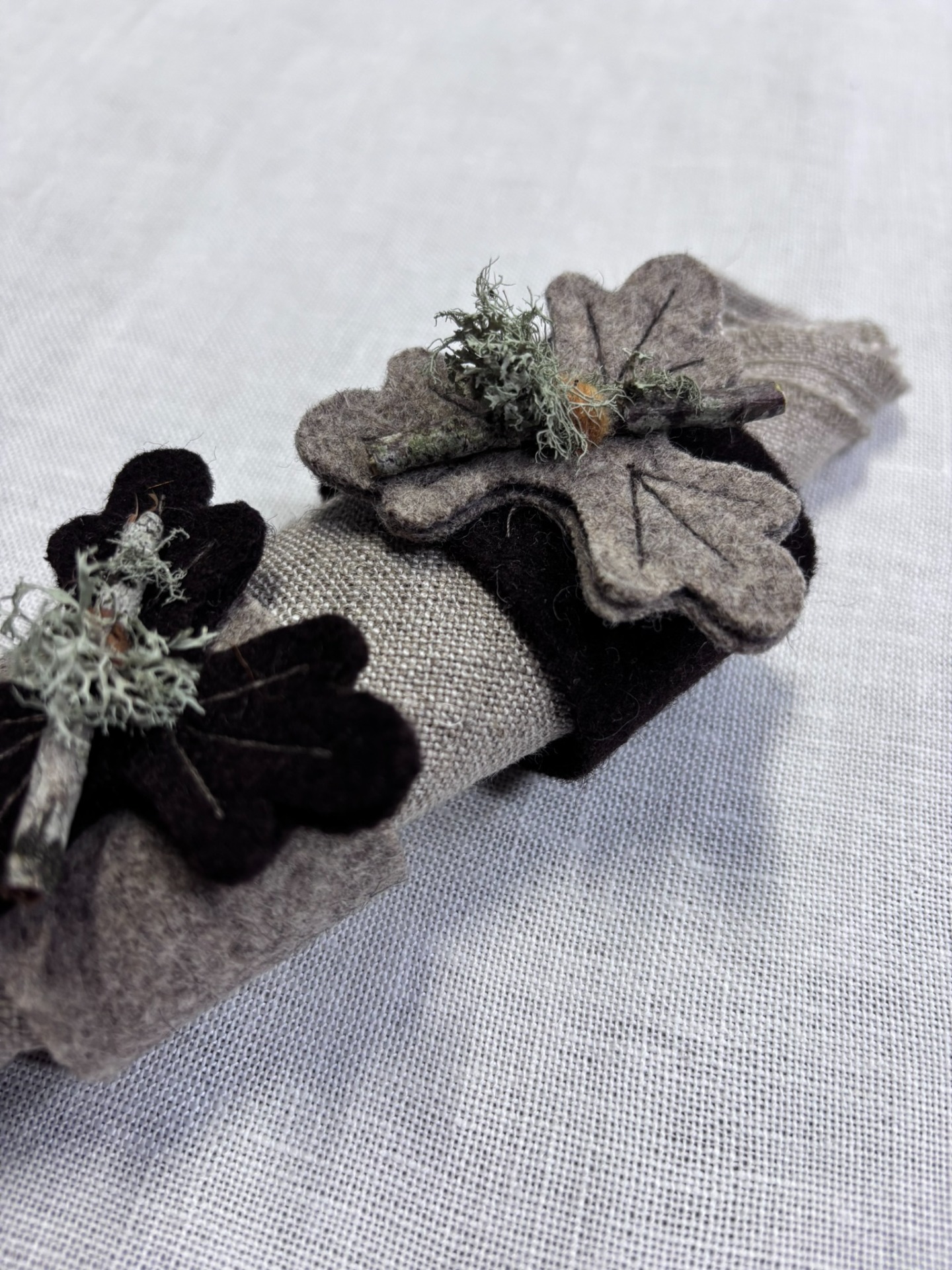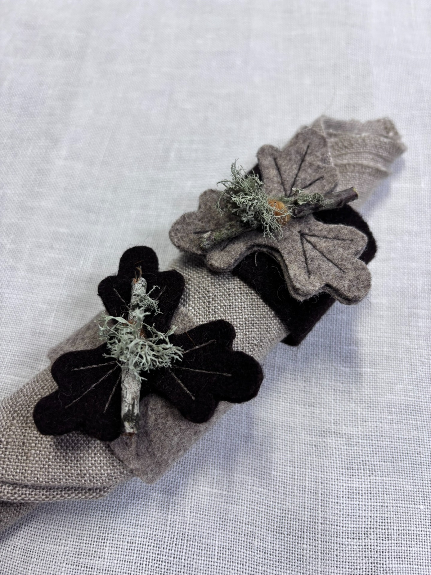 Porta guardanapos feitos em burel de cor natural antracite e castanho, com detalhe de raminho de carvalho.
