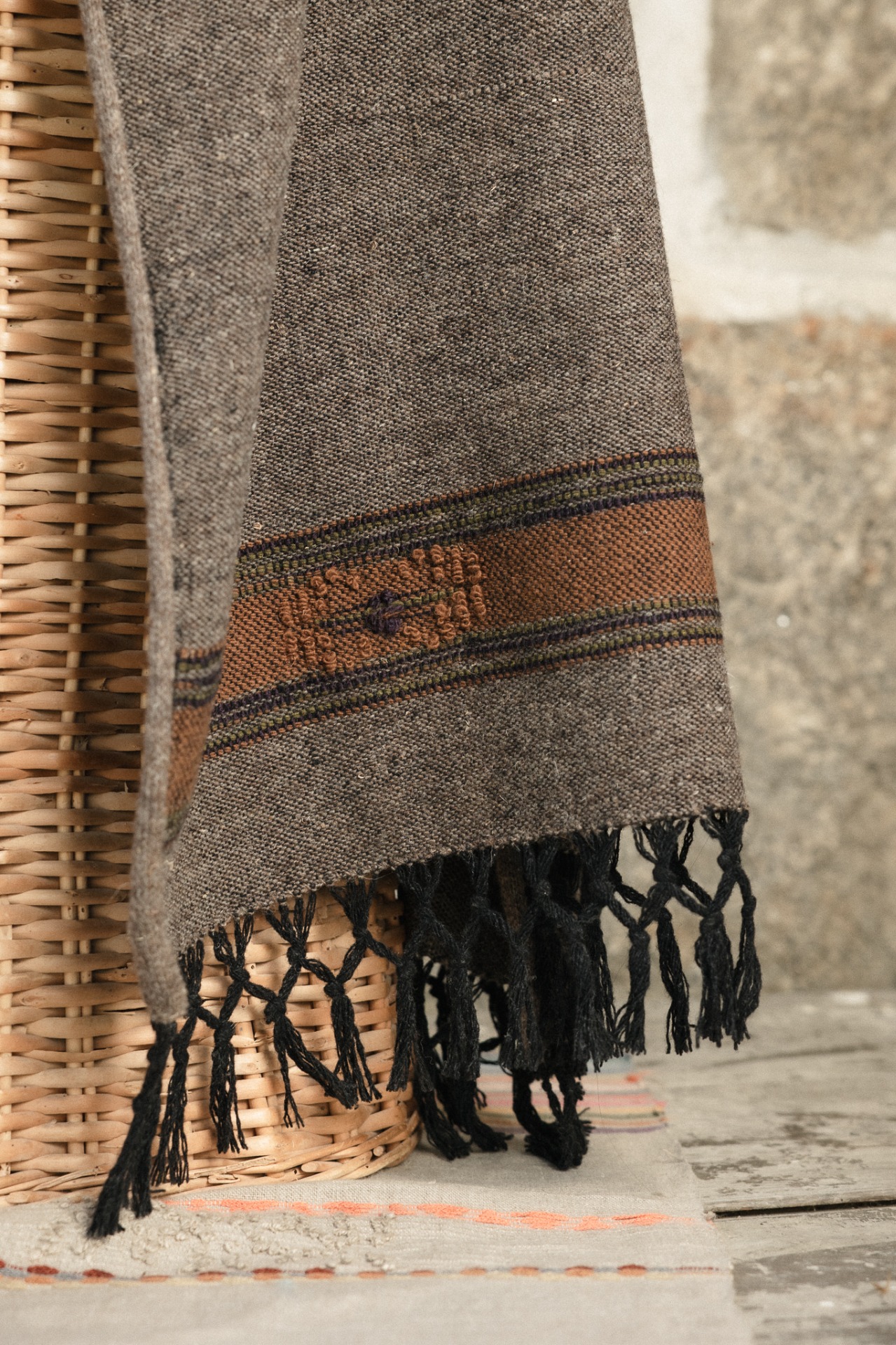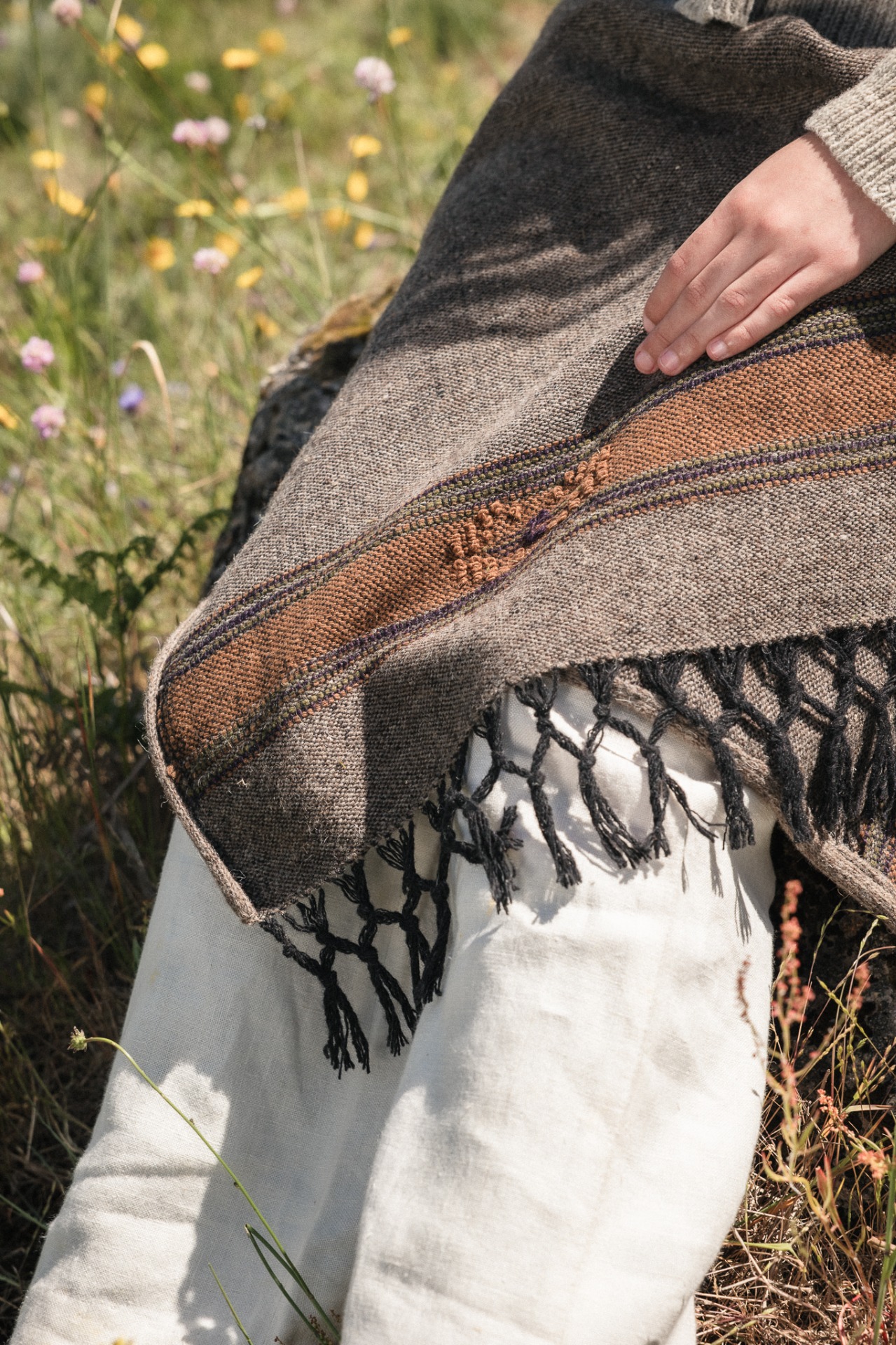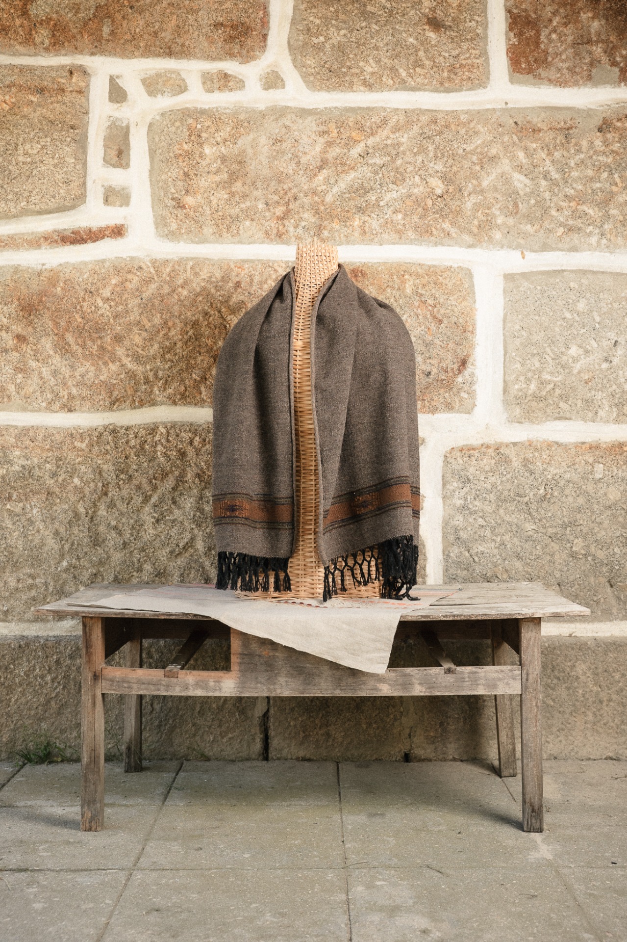 Echarpe em tecelagem de lã de ovelha em tear manual com a técnica de puxados, com detalhes de cor, franjas e aplicação em malha.