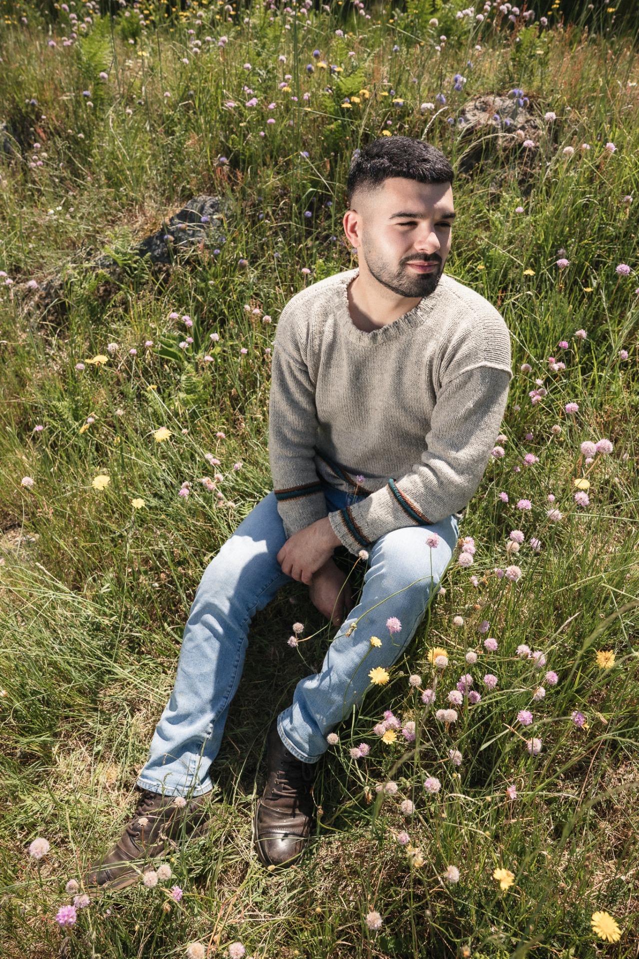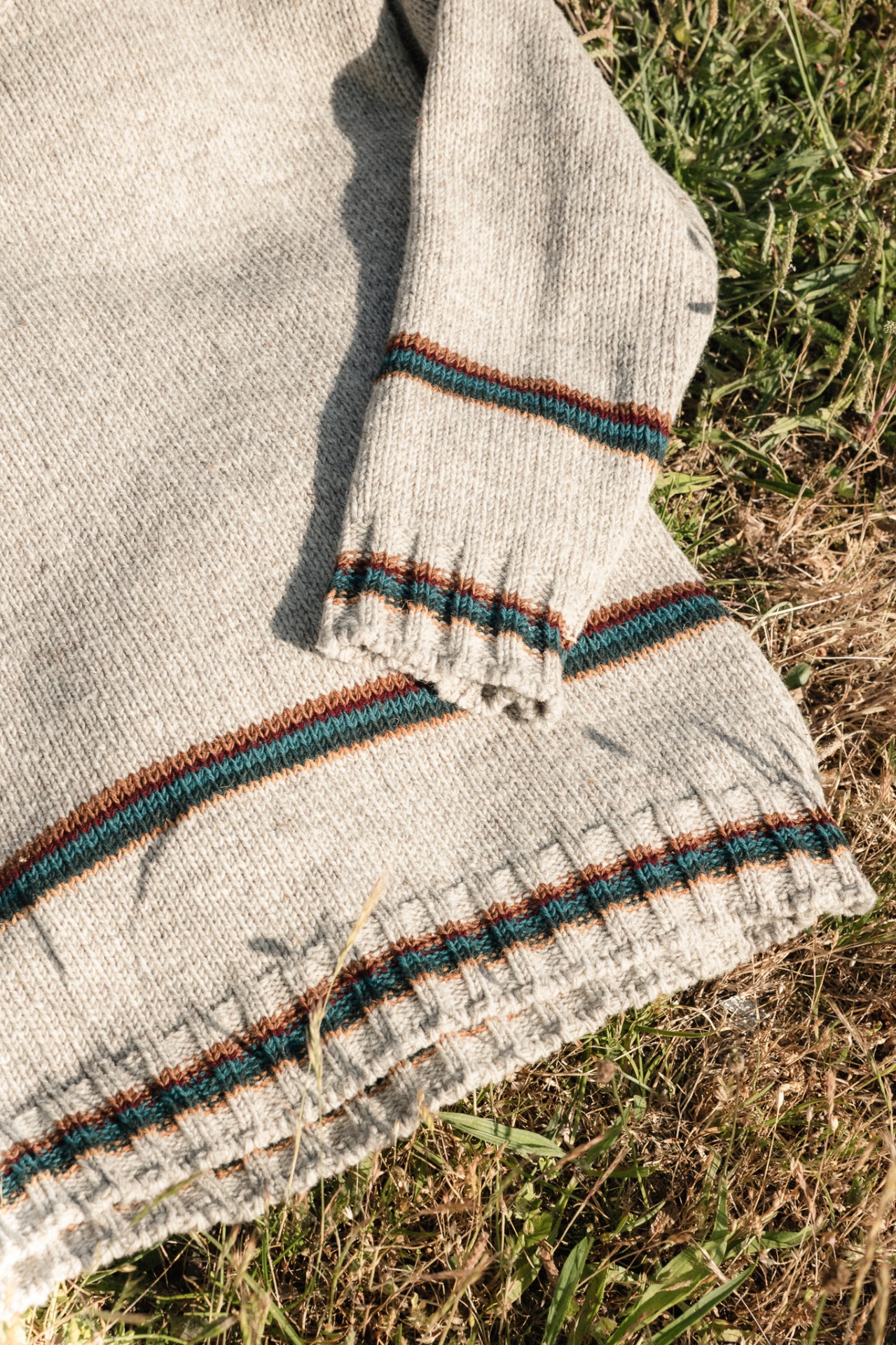 Camisola em lã de ovelha, cor natural mesclado com detalhes de riscas colorida.