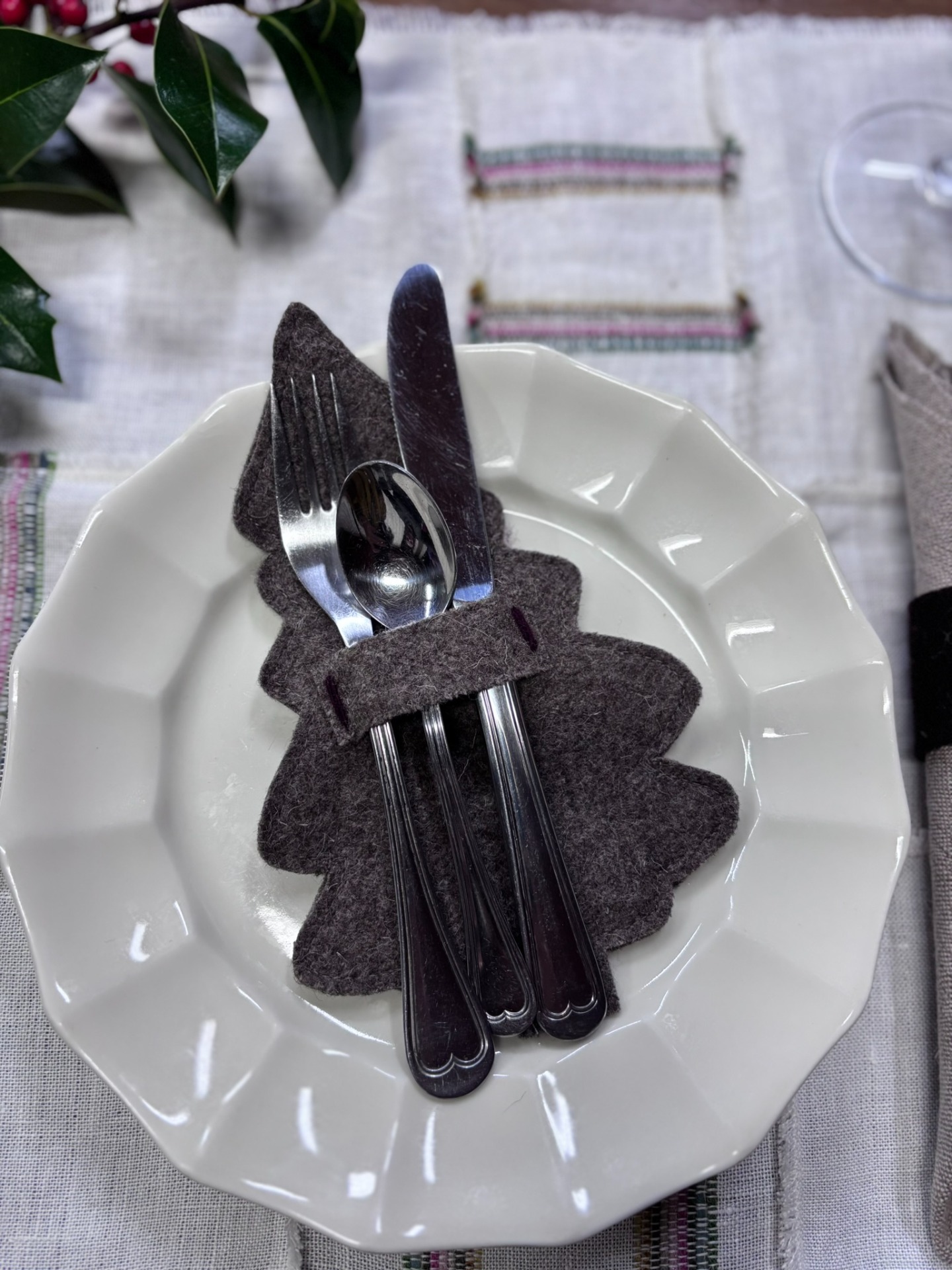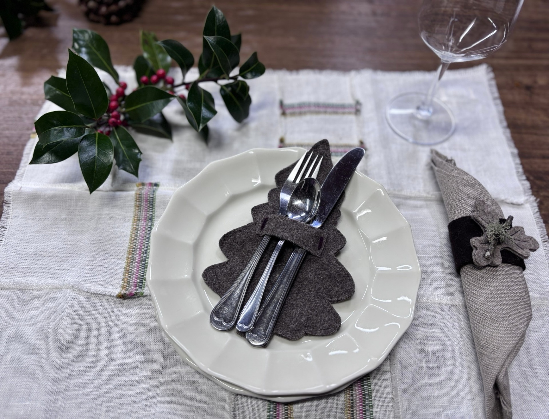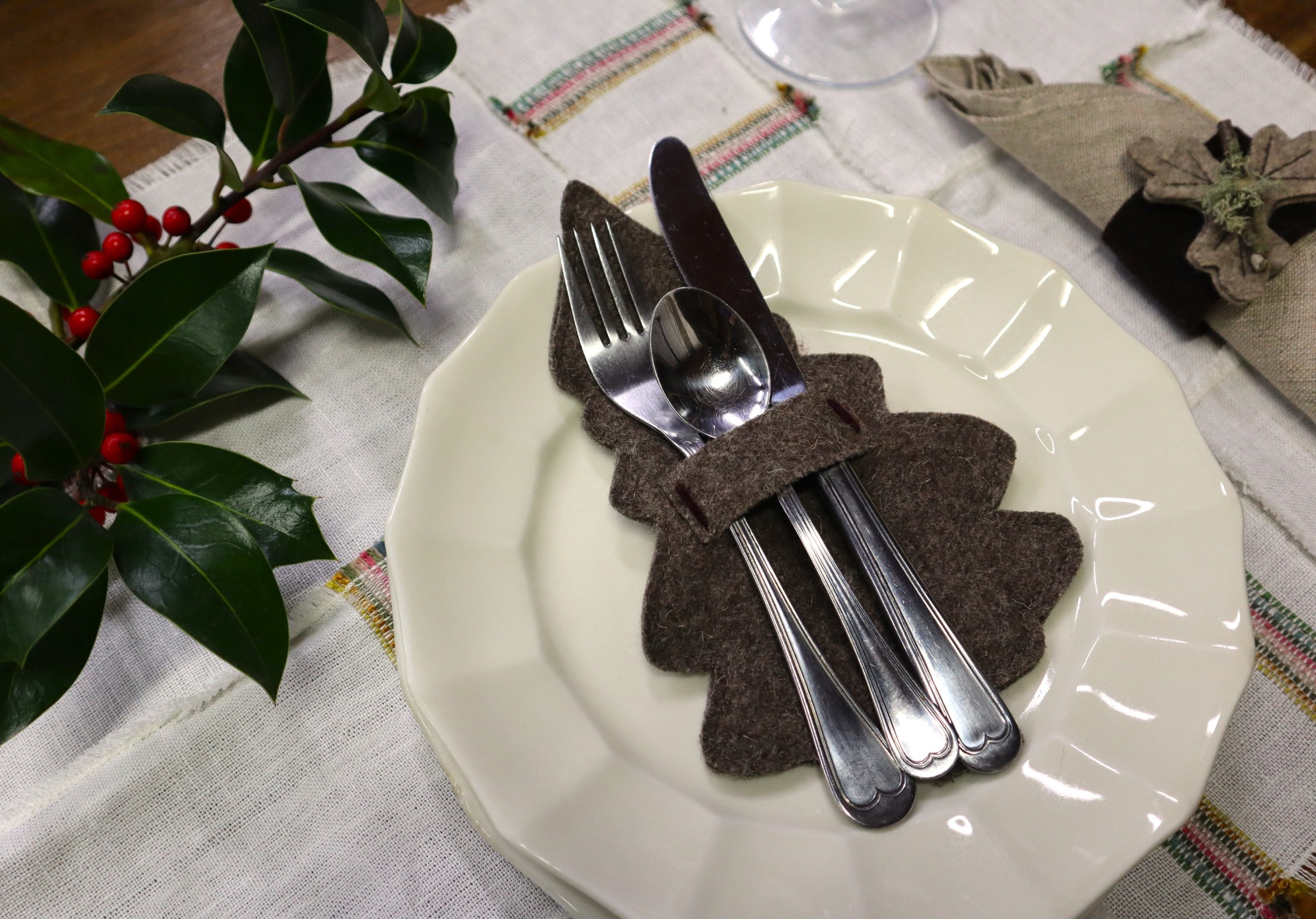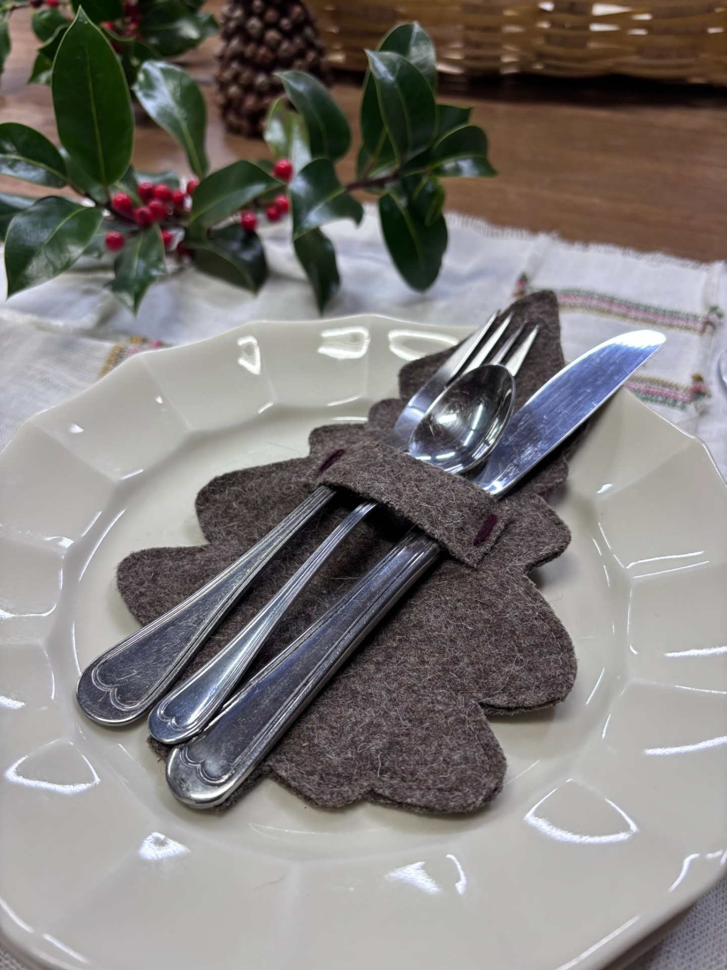 Porta talheres em burel, pespontado com lã em bordô e folha de nogueira.