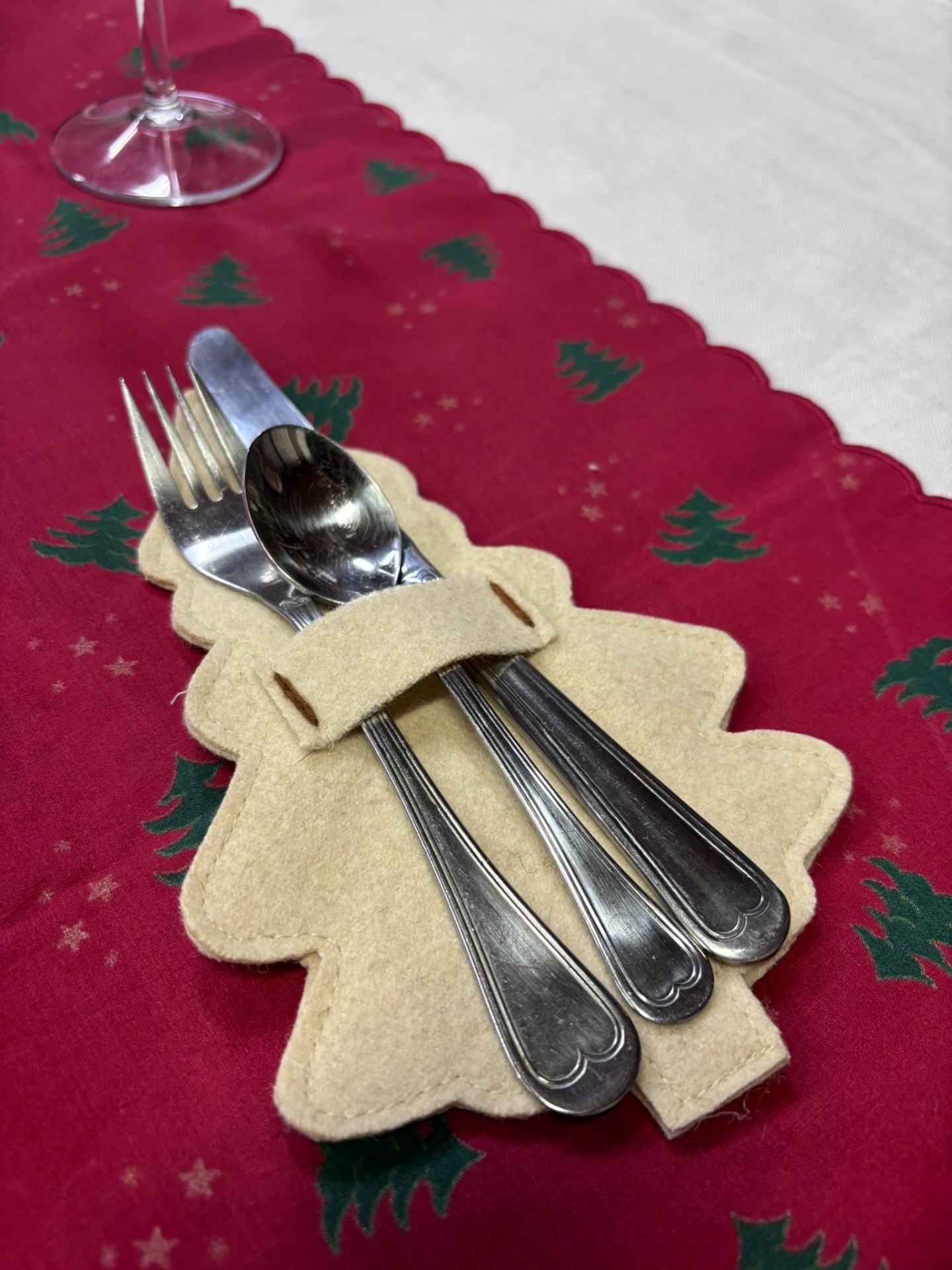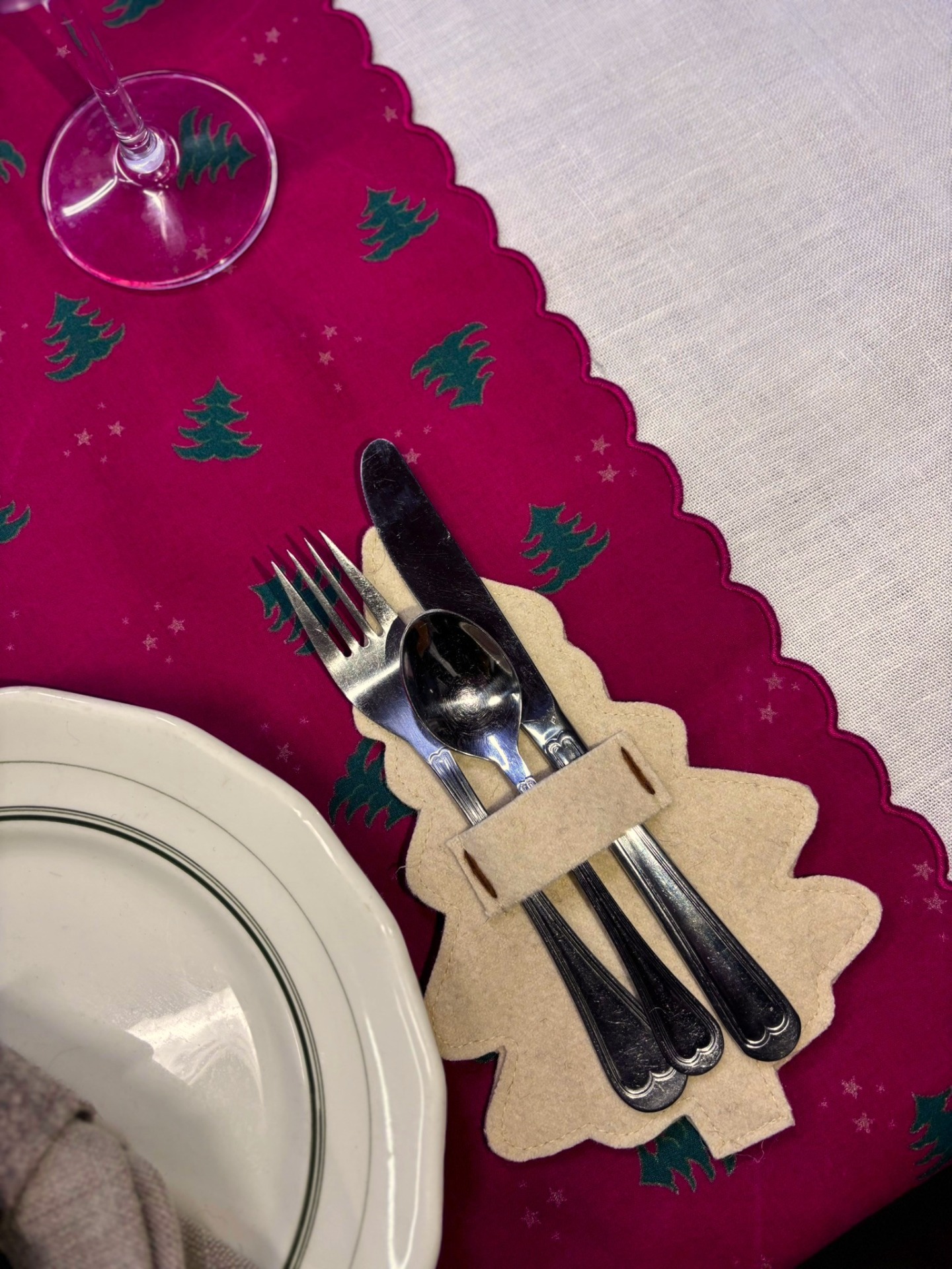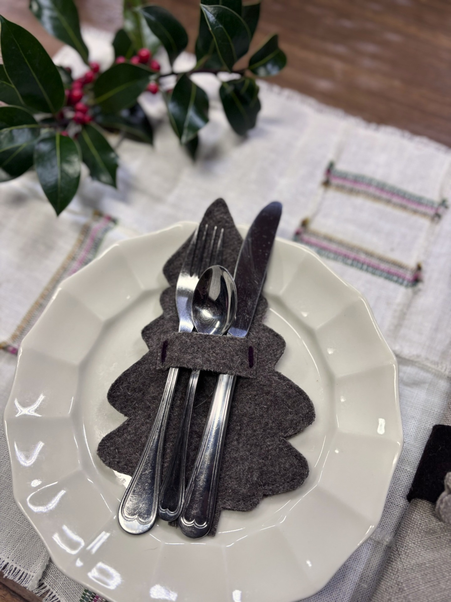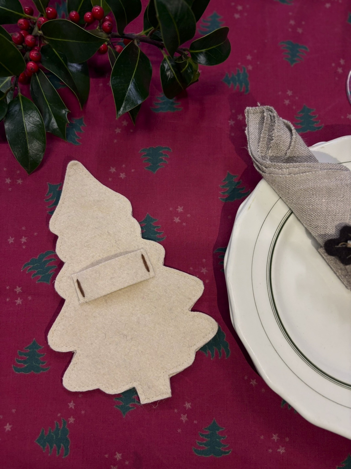 Porta talheres em burel, pespontado com lã em bordô e folha de nogueira.
