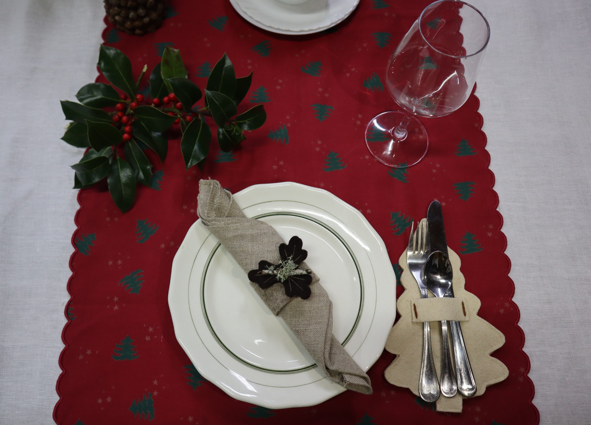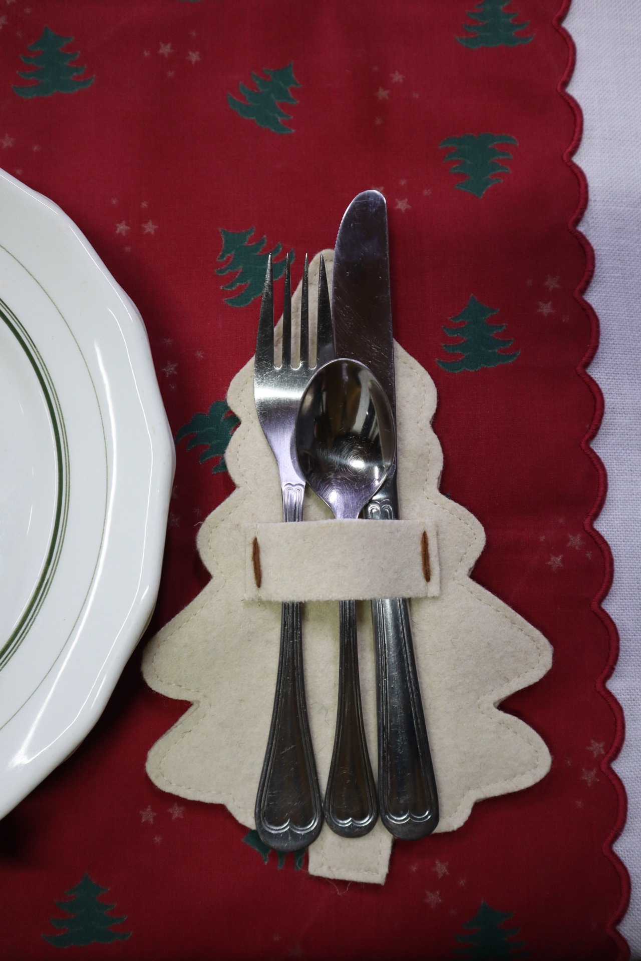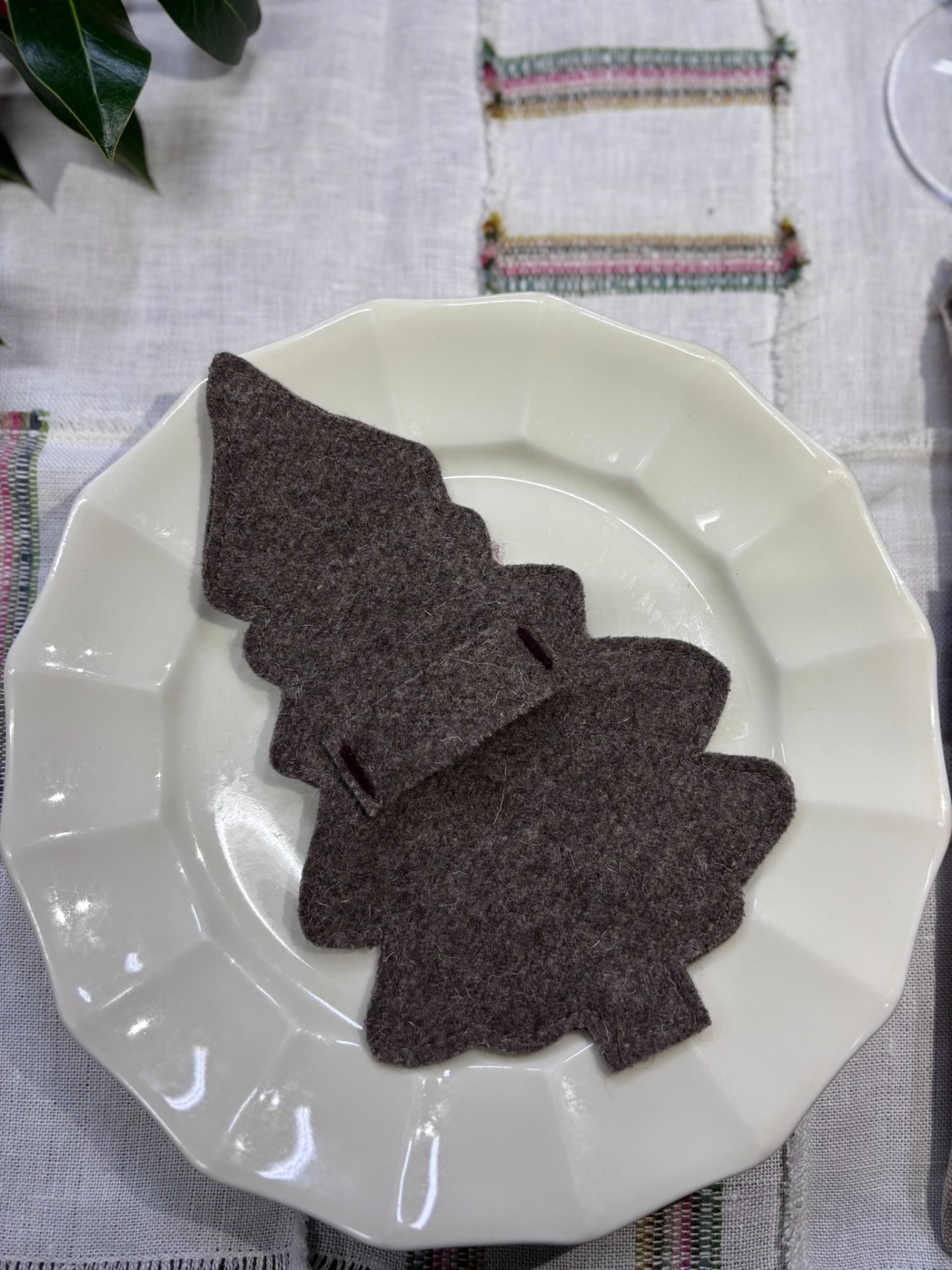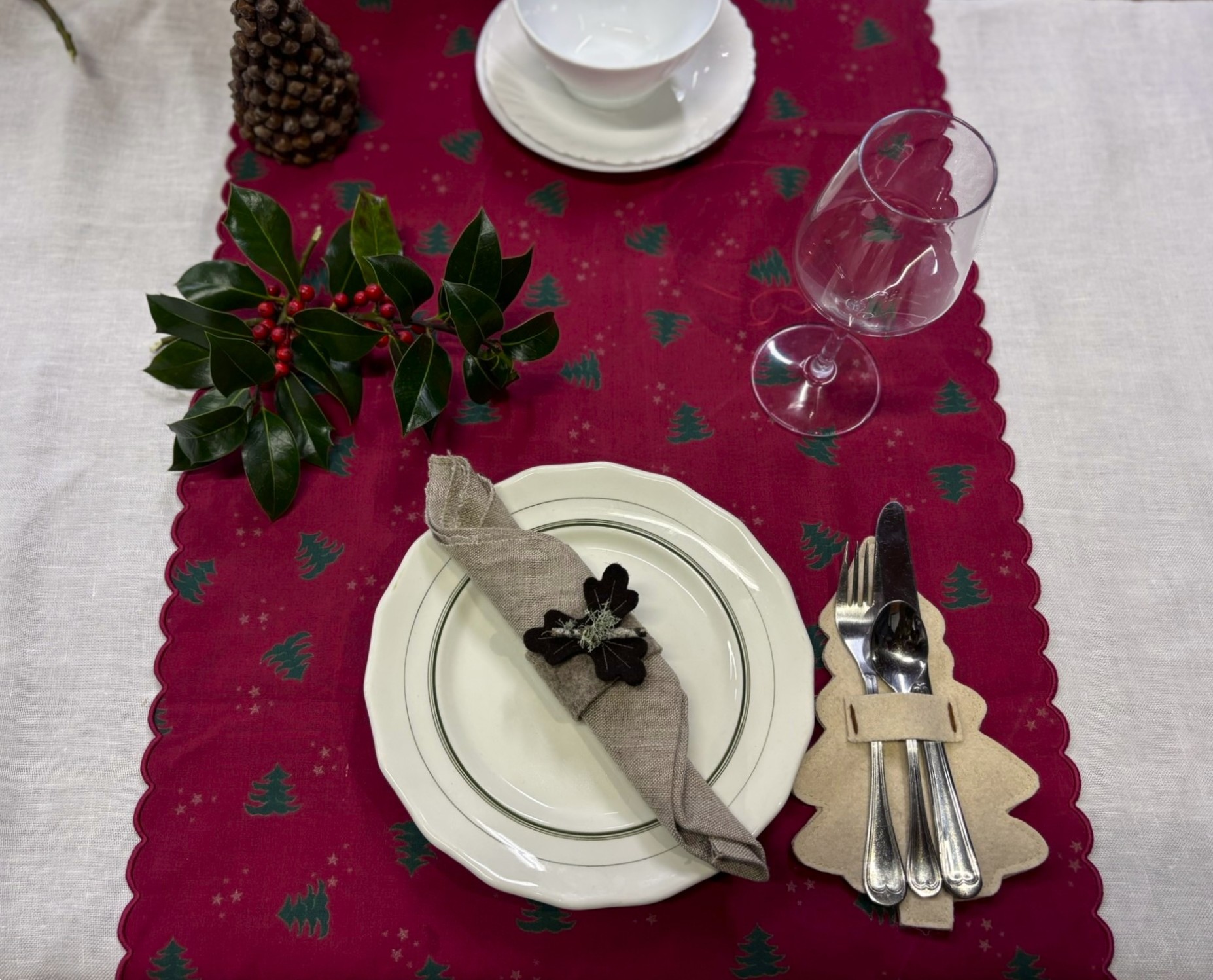 Porta talheres em burel, pespontado com lã em bordô e folha de nogueira.